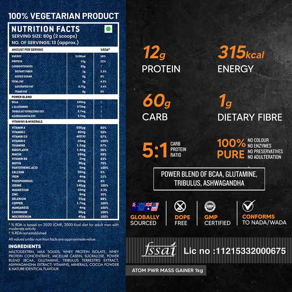 ATOM Mass Gainer helps you top up on clean calories conveniently, fueling intense workouts and aiding post-training recovery. It promotes better bodyweight management and sustained performance with every scoop.