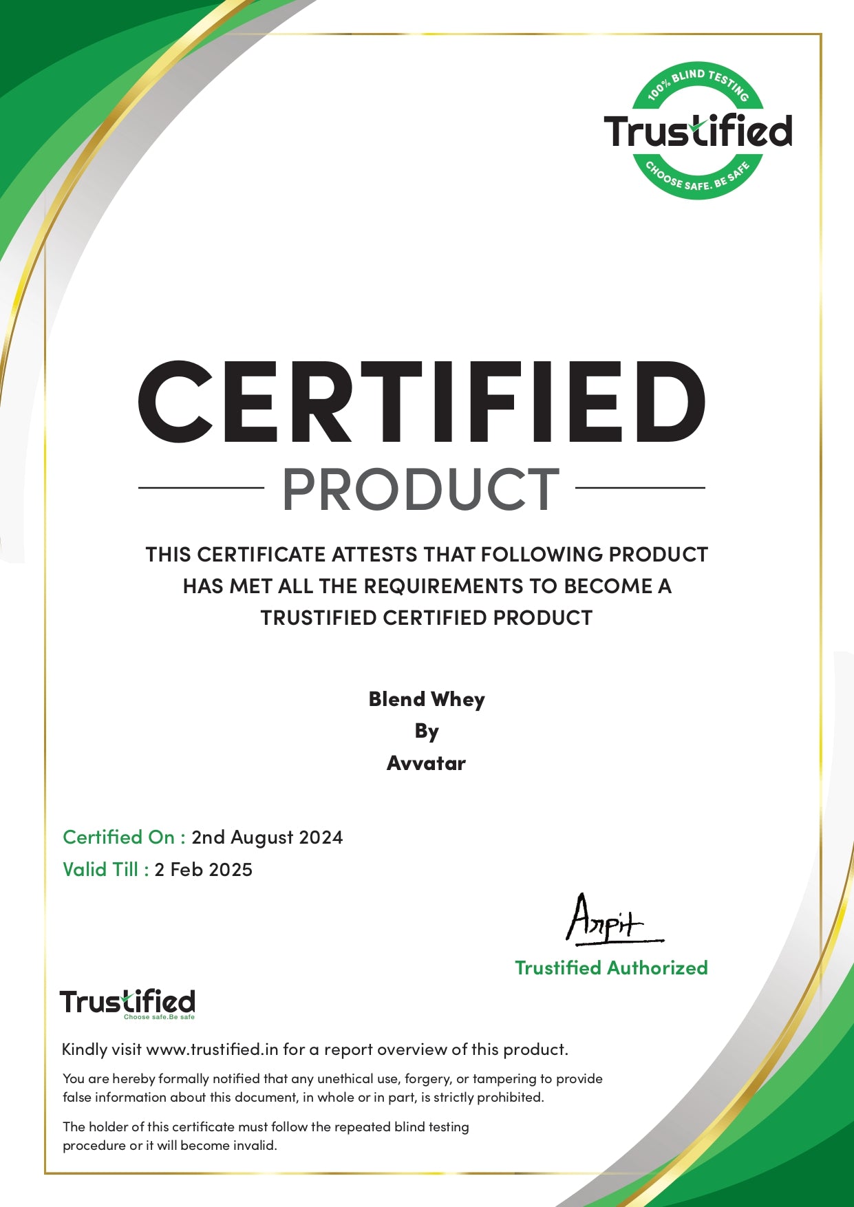 Crafted using only 100% natural flavors, Avvatar Whey Protein delivers a delicious taste without any artificial additives. Each batch undergoes multiple quality tests to ensure purity and performance.
