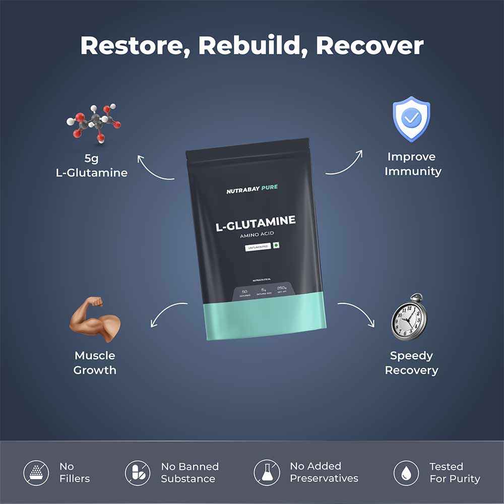 Nutrabay Pure 100% Glutamine is a conditionally essential amino acid supplement. Found abundantly in muscle tissue, glutamine plays a key role in transporting nitrogen into muscle cells, which is crucial for recovery and performance.
