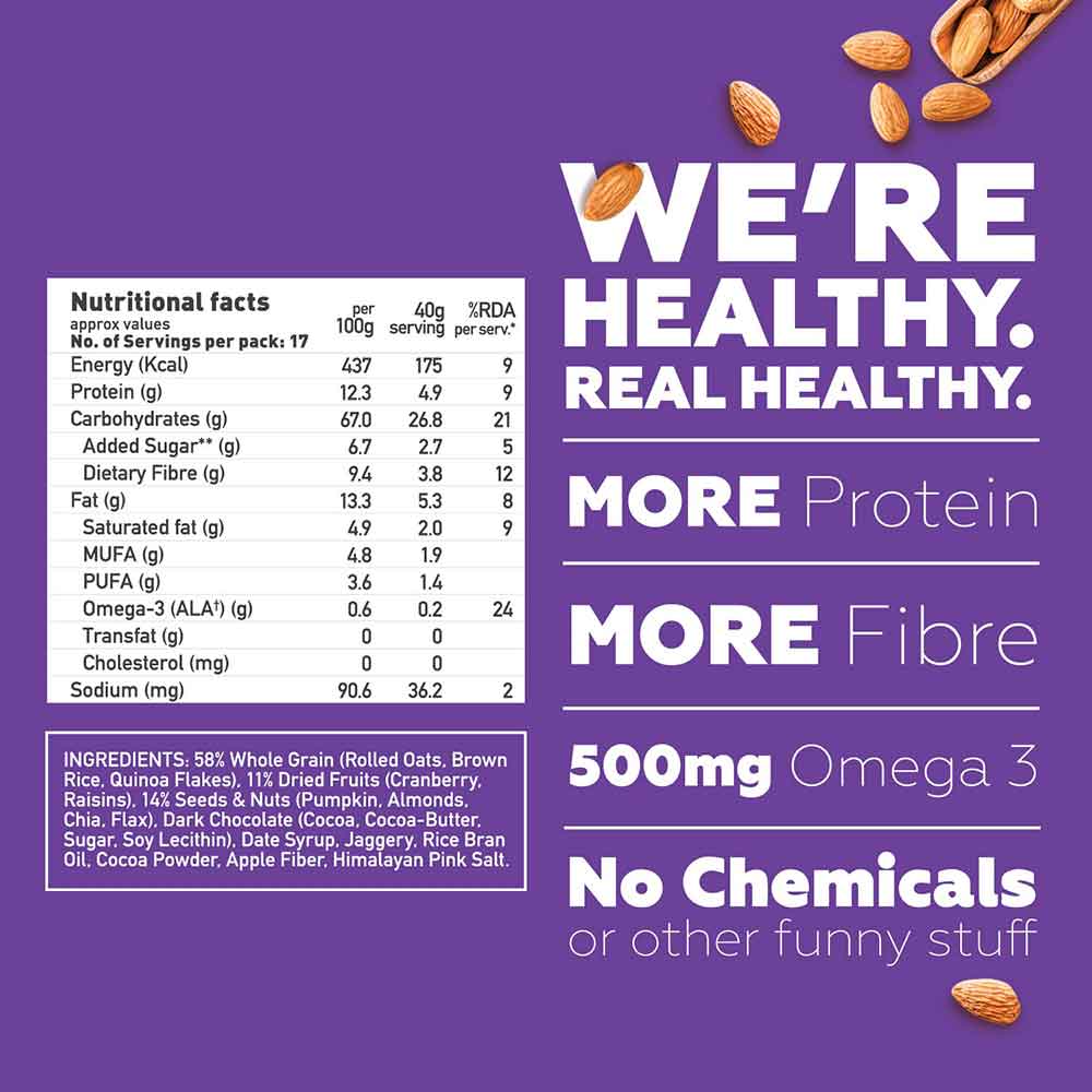 The blend includes wholesome quinoa, oats, and brown rice, complemented by almonds, raisins, and dried cranberries. Seeds like pumpkin, chia, and flax add extra fiber, protein, and omega-3s to keep you energized and satisfied.